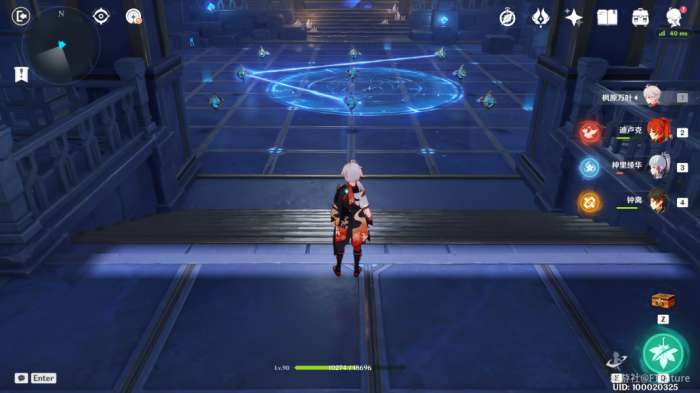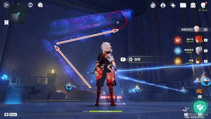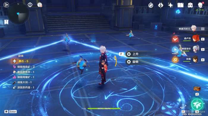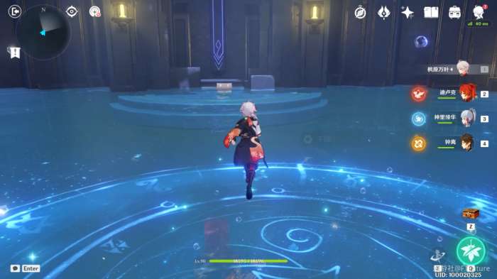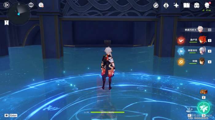 站到水占盘中央交互,选择“上升”,上来之后我们往东北边看,可以看到水对面的平台上有一个普通的宝箱(宝箱1),过去将其拾取。
