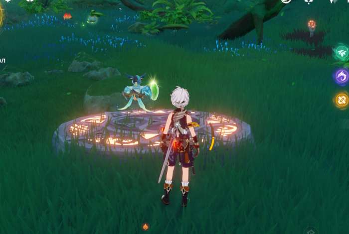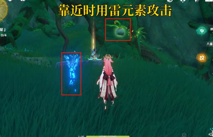 谜题这里需要我们点亮四个火把,其中,有两个火把属于未现形状态,我们需要在空中悬浮的[三相众物]移动到未现形火把附近时,用雷元素攻击[三相众物]即可使火把现形。