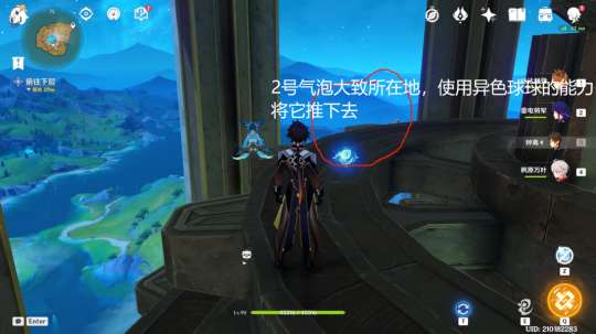 使用异色球球的能力把在面前的气泡推下去(小心推过头)