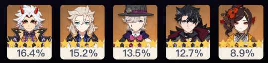 阿贝多一共有3次UP,如果加上本期混池,那就是一共4次了。持有率的原因和荒泷一斗相似:玩岩队的人少。原本阿贝多还有一支合适的队伍是胡行钟阿,但后来双水共鸣改版,超模角色夜天后强势加入胡行钟队,让阿贝多失去一个就业岗位。