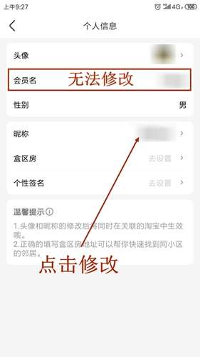 点击完头像后,我们就来到了个人信息编辑的界面,在这个界面我们发现我们有两个名字,上面那个名字其实是我们的淘宝用户名,这个是无法修改的,我们能修改的是下面的那个昵称。