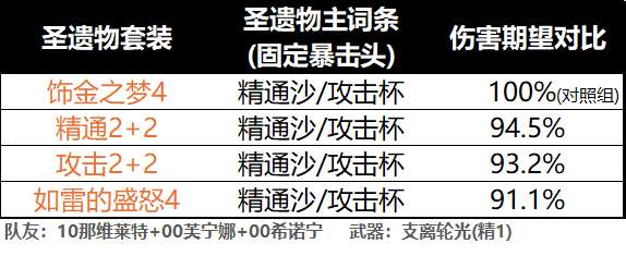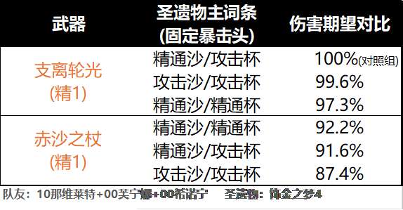 总结:头部固定选择暴击率或暴击伤害,暴击率建议70%+;沙漏和杯子除武器使用[赤沙之杖]外,建议都选择攻击力,在保证伤害的同时兼顾E技能盾量,武器使用[赤沙之杖]时,沙漏和杯子建议其中一个选攻击力,另一个选精通;副词条:双暴>精通=攻击力%。