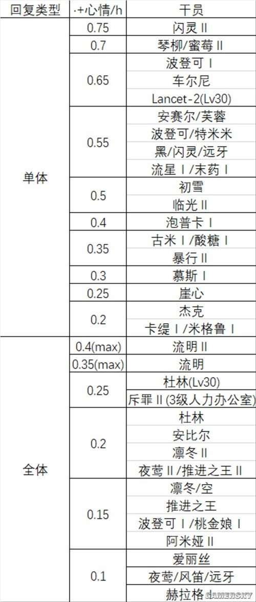 下图为拥有单体恢复技能和群体恢复技能的干员列表: