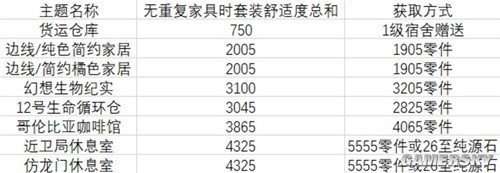 当选择主题使用快速布置时,会布置重复家具。上表只是功利地计算了每个套装的最低舒适度。家具有五种获取手段。