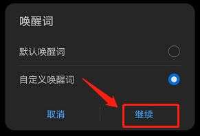 6、在弹出框中,选中“自定义唤醒词”,并点击“继续”按钮。