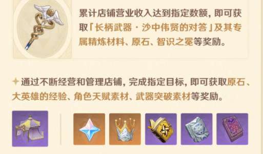 累计店铺营业收入达到指定数额,即可获取【长柄武器·沙中伟贤的对答】及其专属精炼材料、原石、智识之冕等奖励。