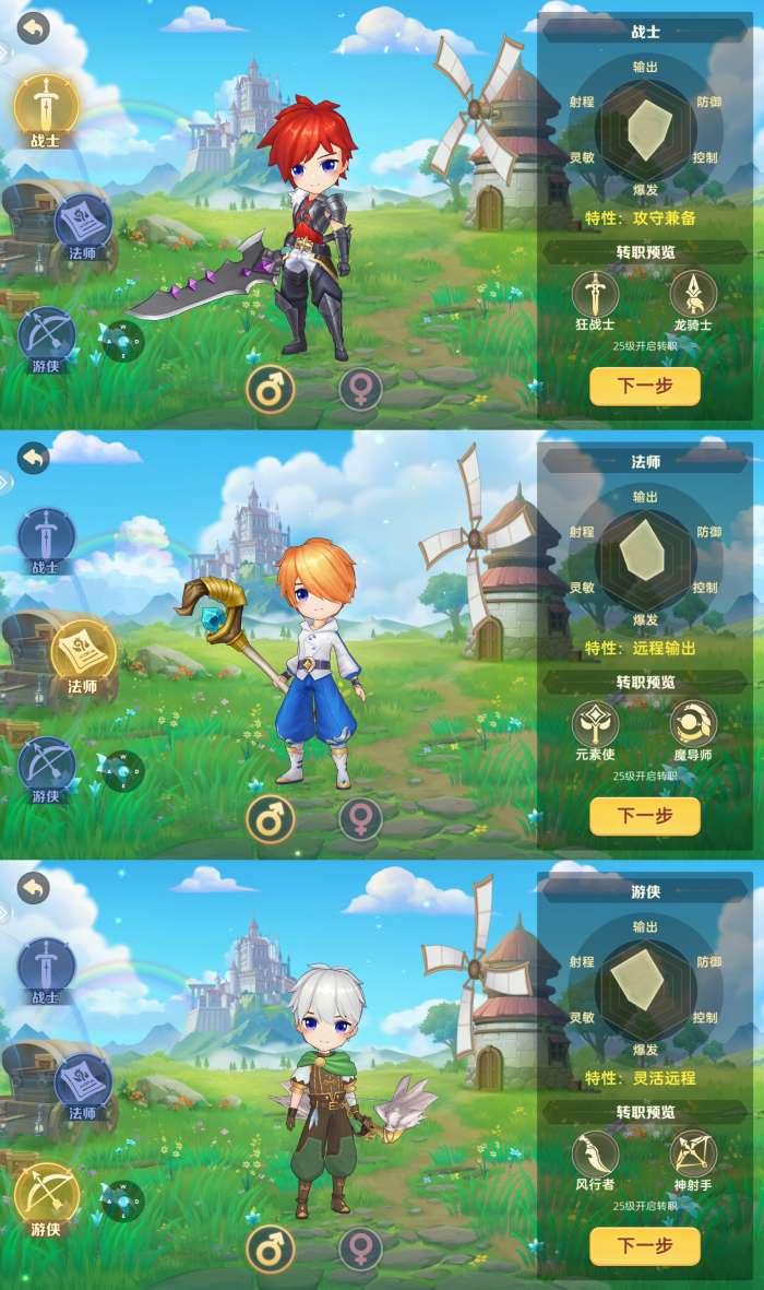 每个职业有不同的职业特性,战士是属性相对均衡的攻守兼备,法师是偏向控制的远程输出,游侠则是射程更远的物理远程输出。