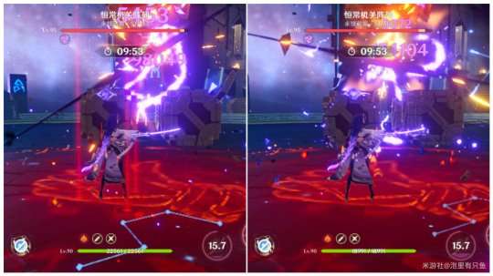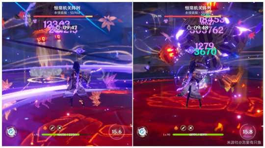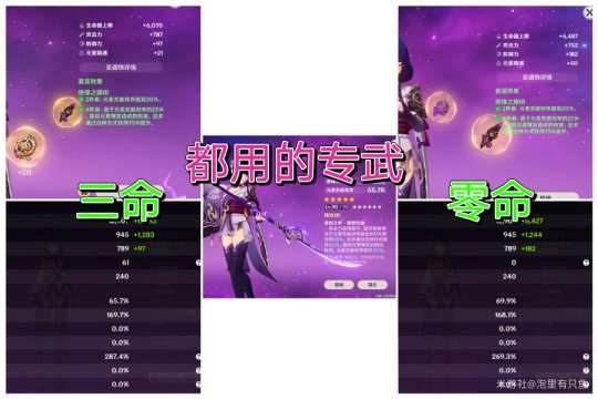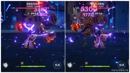 两个雷神都是用的专武来测试,绝缘套。技能都是拉满的。(面板上圣遗物差别在很难做到完全一致,只能尽量配平。爆伤差距1.6%,充能效率差距18%左右。)后面的伤害比较都是基于这样面板得到的数据。