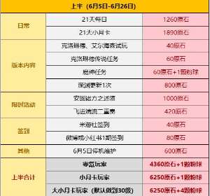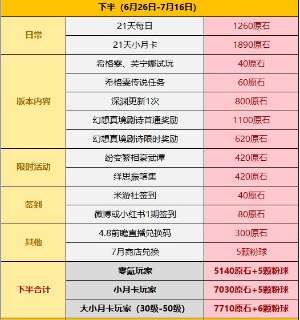 零氪玩家:可以获得9500原石+6颗粉球,大约相当于65抽;其中上半有28抽,下半37抽。
