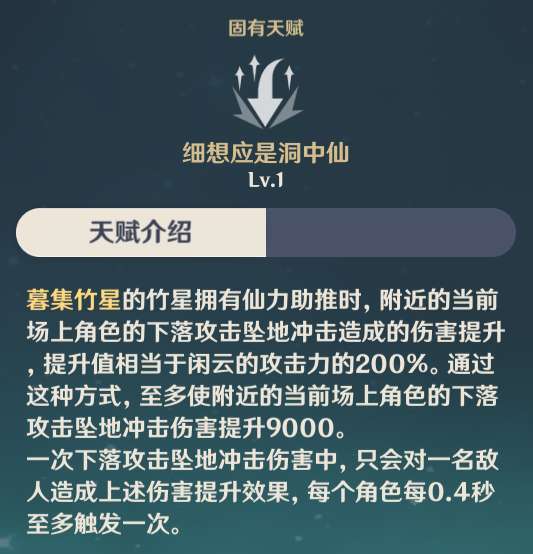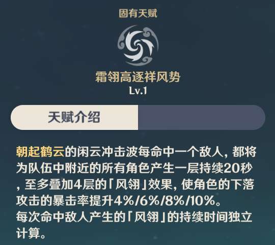 闲云还有2个固有天赋,一个是增加全队角色的下落攻击暴击率,最多提升10%。