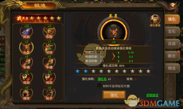 3、强化有几率成功或失败,每次强化需消耗一定的强化石或者用钻石替代