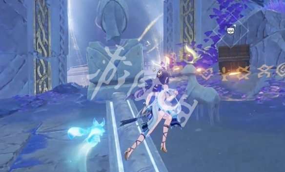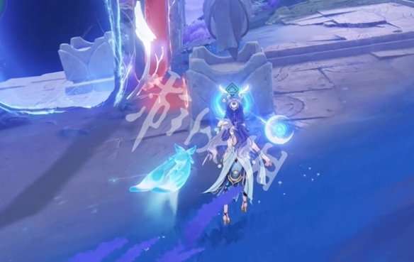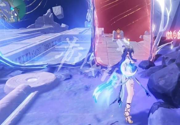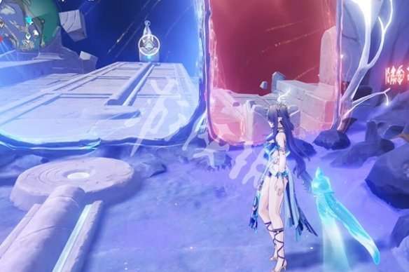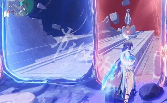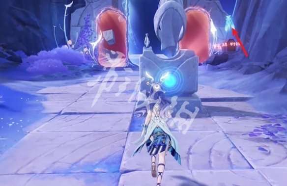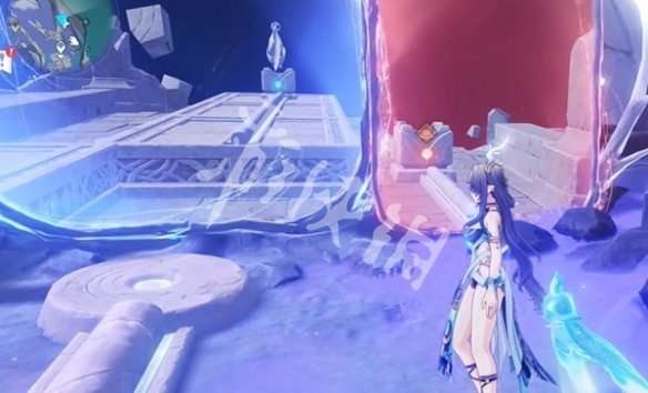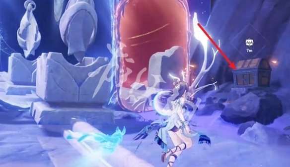 4、走到雕像右侧的蓝色镜子前,它会自动推动雕像,从而打开宝箱。