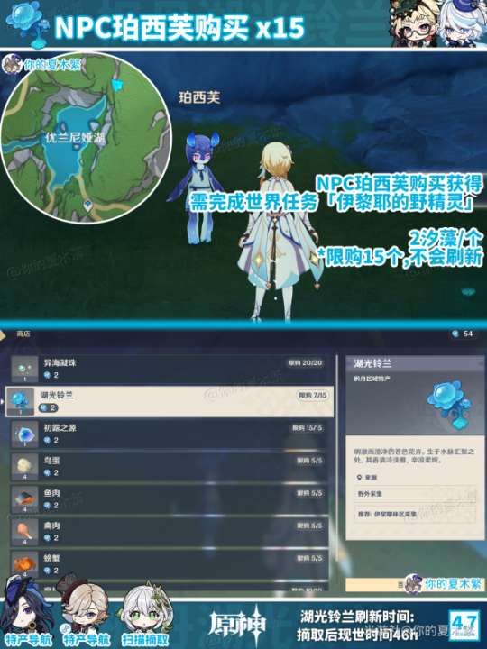 NPC珀西芙可以用用2个汐藻换1个湖光铃兰,限量15个