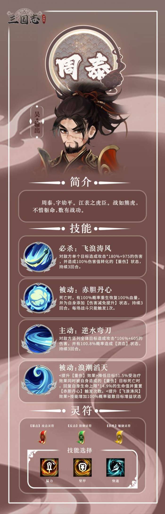 软件提交 专题合集 热门手游周泰是吴国输出型武将,特点是死亡可重生并提升能力,能直接点杀后排并施加重伤流血压制回复。灵符优先选暴击攻击、状态敏捷、反击防御,改造侧重攻击暴击。阵法石推荐暴击/攻击/命中搭配,培养主加攻击生命,性格选暴躁勇猛。