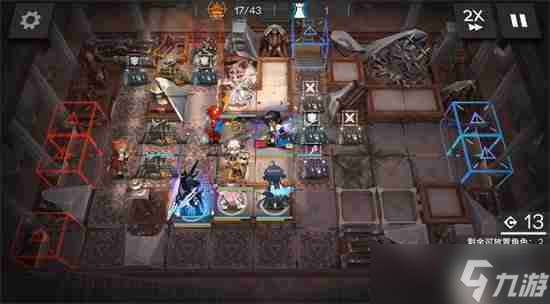 开局使用德克萨斯解决前排两个敌人。随后部署:桃金娘(左)、煌(上)、棘刺(下)、小羊(左)、塞雷亚。最后,在左侧部署流明挂机即可。