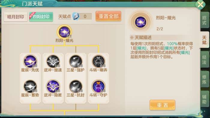 星辰禁锢:常规封印技能,被封印的单位无法进行攻击或者使用招式一定回合,在烈阳系天赋的加成下有一定的封印命中率提升,是耀光本源流最基本且最常用的招式。