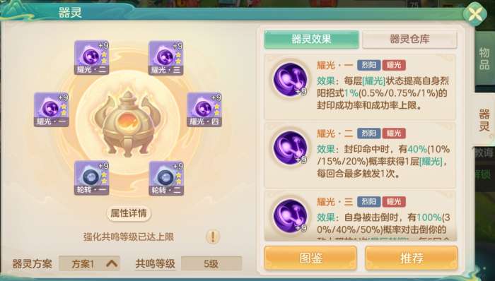 耀光器灵套装:耀光器灵套装是一套能帮助烈阳封印快速堆叠“耀光”层数以及加强“耀光”状态效果的器灵。这套器灵可以广泛地为自身根据耀光层数提高封印命中率,并且缩短堆叠耀光的速度,加速触发多封的回合,大大提升了耀光本源流派多封扩散的特点。部分套装还能进一步在多封时额外提升收益,可谓是耀光本源流的不二之选。