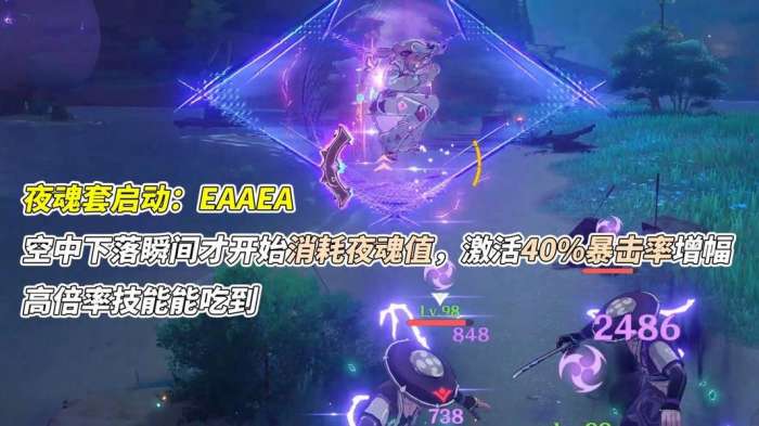 ②长夜之誓套:上限更高,提供100%下落攻击增幅(EA起手已叠4层后续维持5层),此时双暴就基本依赖于圣遗物主副词条与武器了。可选择‘攻击沙、雷伤/攻击杯、暴击头’。