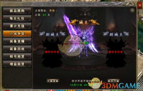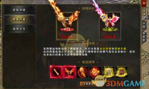 参加方式:活动时间进入攻城地图,首次争霸开启时间为开服后第三天的20:30-21:00,之后为每周六的20:30-21:00