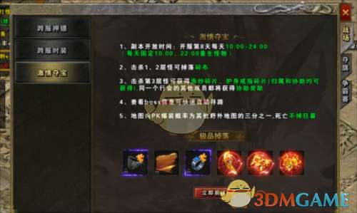 活动副本开放时间:开服第8天每天10:00-24:00(每天固定10:00,22:00重生怪物)击杀1层,2层怪可掉落碎布。击杀第三层怪可获得面纱碎片,护身戒指碎片(归属和协助均可获得)同一行会的其他成员都将获得协助奖励。查看BOSS信息可快速寻路,地图内PK爆装概率为其他野外地图的三分之一,死亡不掉狂暴。