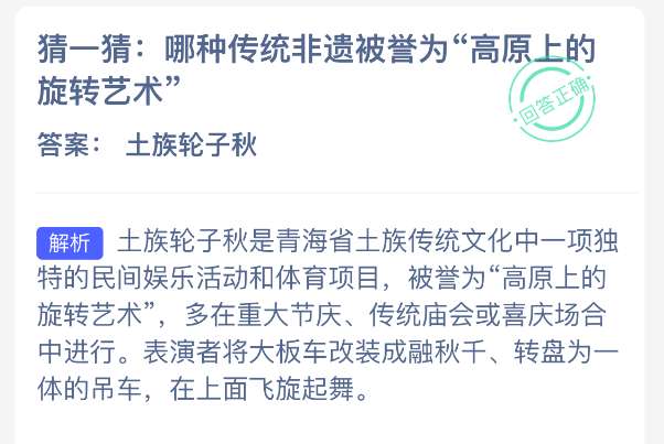 软件提交 专题合集 热门手游猜一猜:哪种传统非遗被誉为“高原上的旋转艺术”?【蚂蚁新村每日一题】2025年12月15日题目已发布!坚持答题,积累木兰币,即可加速小镇建设。答对本题,立即可享“产速+3/时”的加速奖励!今天正确答案是【土族轮子秋】。土族轮子秋是青海省土族传统文化中一项独特的民间娱乐活动和体育项目,被誉为“高原上的旋转艺术”。