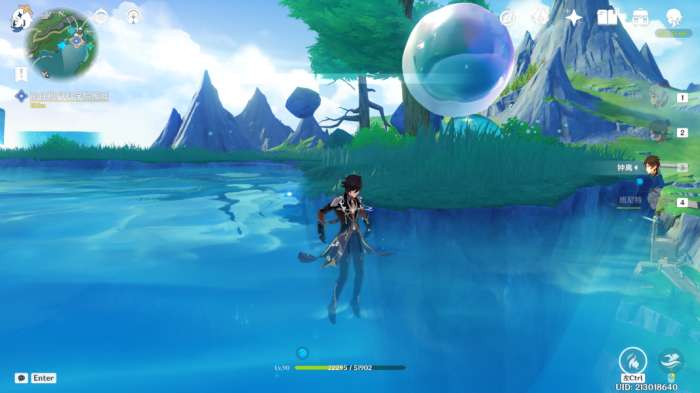 2.1传送之后进入水体,上游,跟随水泡(下图),直至水泡消失出现传送水环;