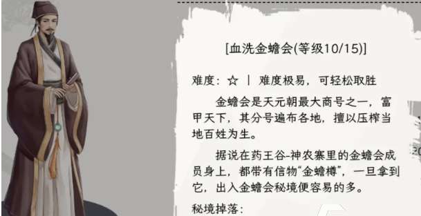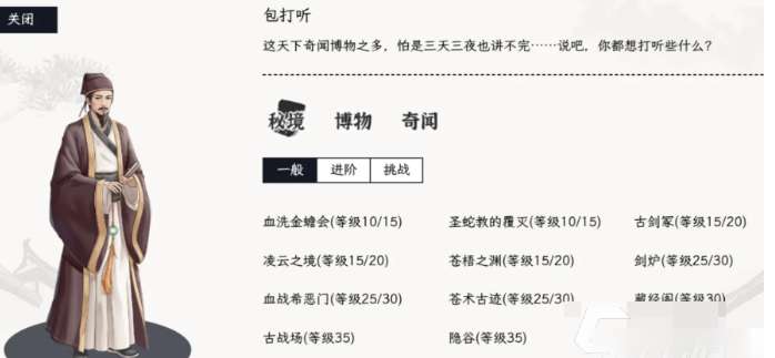 想要顺利进入到秘境大家首先需要得到一个信物,而信物获取有两种方法,一个是打败游戏选择的精英级别的BOSS,再有就是来到侠义时间当中,选择一个事件触发然后拾取。将信物给包打听,在该游戏中秘境分为十一个等级。