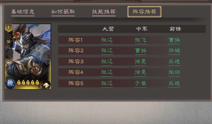 3、阵容3(五子良将流):大营张辽 + 中军徐晃 + 前锋乐进