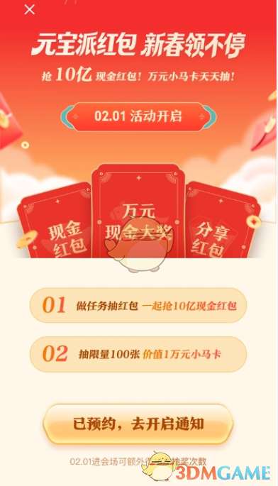2、活动设置了万元“小马卡”、现金红包和分享红包等红包形态。活动期间,用户每天上元宝App都能领现金红包,通过做任务可获得更多抽红包的机会,并有几率抽中限量100张的价值1万元“现金小马卡”。