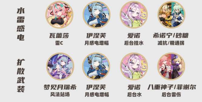 1.水雷感电队:成员:瓦蕾莎(雷 C,负责主要雷元素输出)、伊涅芙(月感电增幅,强化元素反应伤害)、爱诺(后台挂水,提供水元素配合触发感电)、希诺宁 / 砂糖(减抗 / 精通拐,提升队伍整体输出能力)。