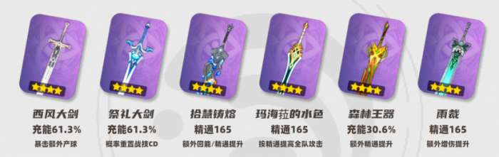 1.西风大剑:充能效率为 61.3%,暴击后额外产球,能有效帮助角色及其队伍循环充能,适合大招流玩法。