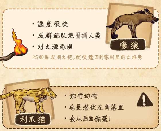 嚎狼总是成群结队地捕猎,它们速度很快,如果被追上,它们会全体围捕过来,你将无处可逃。但幸好它们对火源恐惧,所以遇到它们后,如果没有火把,就快速回到自己家园里的火堆旁。