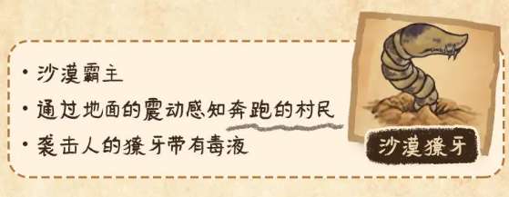 沙漠獠牙是沙漠霸主,它虽然无法看到,但是可以通过地面的震动感知到在沙漠上奔跑的村民,从地底下破土而出亮出带着毒液的獠牙袭击你。(撒腿就跑)