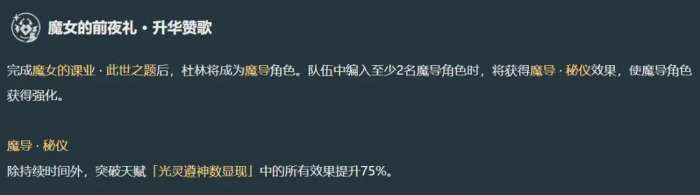 杜林与另一位魔导角色组队时,可以激活此天赋。首批魔导角色有:杜林、莫娜、温迪、可莉、阿贝多、菲谢尔、砂糖、雷泽。
