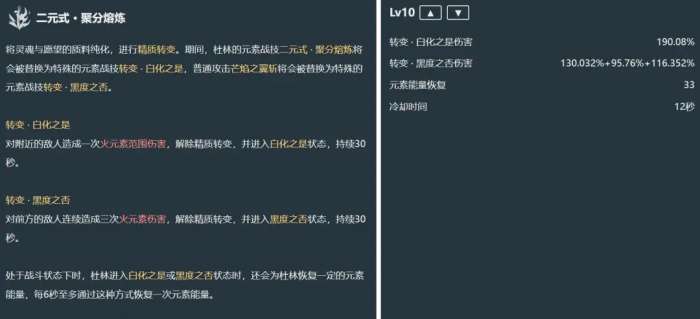 (2)白化之是/黑度之否固定回能33点,此外,战技命中敌人时产生4颗火元素微粒,而杜林大招耗能70点,所以杜林本身并不太缺充能。