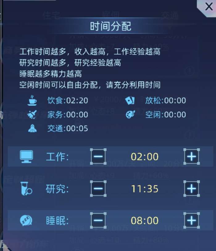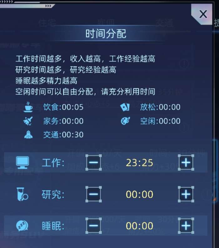 睡眠8小时,工作建议留一两个小时用来提升等级(也可以不留,我喜欢留两个小时),吃住出行全部用最好的,雇佣全拉满(前提是不能负收入,或者不负太多) 剩余时间全部科研,主要科研的就是精力,提升收入(it职业研究学习算法,娱乐圈研究演员自我修养,星空舰队导论)