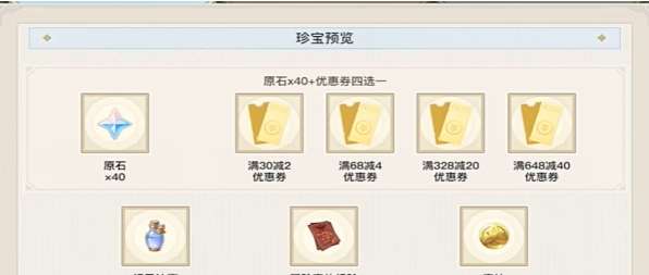 3、单个角色在活动期间最多可获得原石x40+优惠券四选一1次。