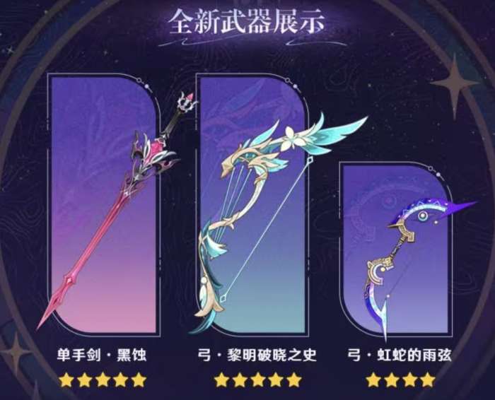 而在6.2版本中,也会有3把新武器的上线,如图所示,分别是:单手剑黑蚀、弓箭黎明破晓之史,以及新四星弓箭虹蛇的雨弦。