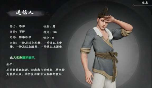 这两种选择会让事件往不同的方向发展,玩家如果选择通过和送信人提升关系的方式,和平的获得这封信,那玩家就可以拿着这封信去质问马夫人,这时候马夫人就会询问玩家想要钱还是想要人,如果玩家选择想要这个角色,那就会直接触发战斗,在赢得胜利之后,最先暂时离开当前的位置,后续挑战过程中,马夫人会再次飞鸽传书约玩家见面,在这一次对方会让马世贤和玩家对抗,大部分玩家在这个时候都会战败,一旦战败之后就会直接触发结局,玩家就会流落街头,触发隐恨江湖。