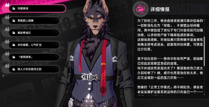 翳是游戏当中的兽人角色,它隶属于意向管理局的禁置机动队,职能是副队长,他有着狼首人身,身着深蓝色的西装,并且在释放技能时,会为自己戴上狼头面具。 他的核心技能是,可以使用影子形态进行高速移动,同时在处于影子形态时,会附带有无敌时间,它不仅可以垂直爬墙,也能规避任何的地形障碍,是很高效率的探索型角色。