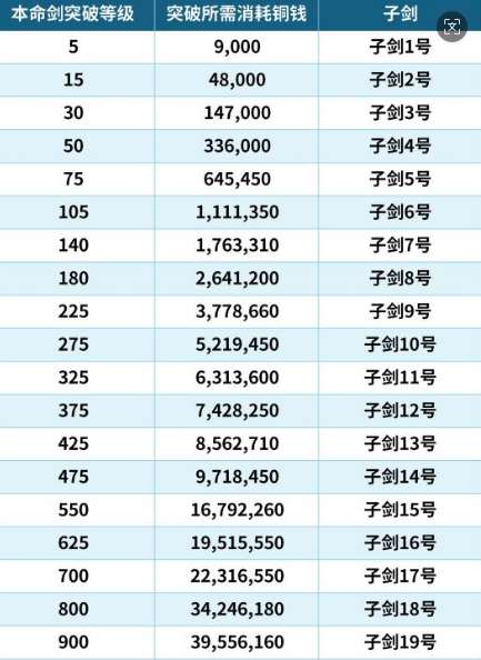 (下图为本命剑突破所需铜钱以及对于产生子剑等级)