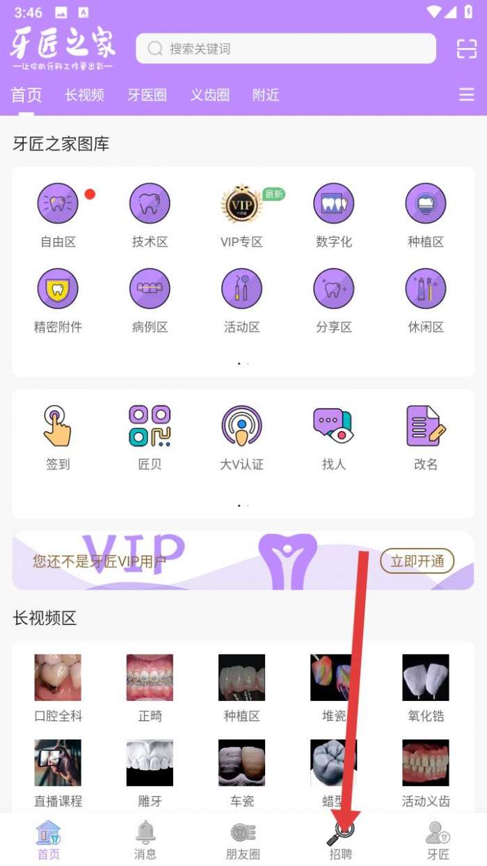 2、进入牙匠之家主界面,界面顶部有搜索栏,下方有牙匠之家图库、长视频区等功能模块,点击底部导航栏中写有招聘字样的图标,进入招聘板块。