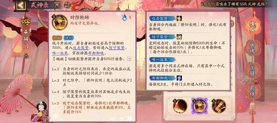 二技能:开局攻击力大于防御的700%,攻击架势,如果小于就是防守架势。主动切换架势会自拉条50%。布都御魂每强化3次,平将门立即进入时之隙。自身时之隙结束后,减益效果缩短1回合。时之隙三技能鬼火减2。