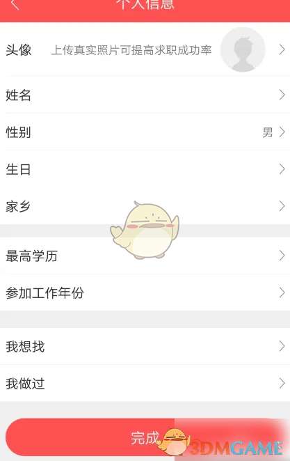 3、点击头像上传自己的真实照片,填写自己姓名性别生日家乡以及学历,选择参加工作的年份