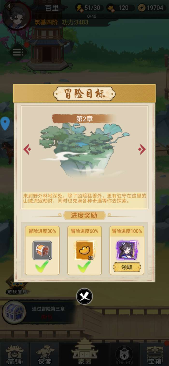 4、第三关又卡关了,这时候看看自己的第二关最后一个宝箱新的侠客领没领,稍微升几级,第三关就很容易了。
