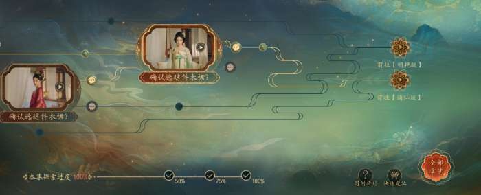 另外,第二集谪仙和明艳肯定有灰色,只要谪仙和明艳都100%了,这是正常的,因为衣服导致选择的路线不同,亮着的代表选了这条路线。和100%进度无关。