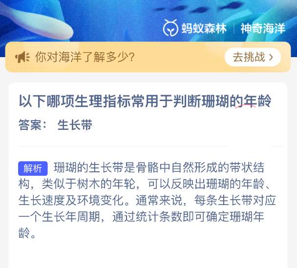 软件提交 专题合集 热门手游以下哪项生理指标常用于判断珊瑚的年龄?【神奇海洋】2026年3月17日新题目已开答!正确答案现已公布,点击领取拼图,一起为修复海洋生态贡献力量!今日正确答案是:【生长带】。珊瑚的生长带是骨骼中自然形成的带状结构,类似于树木的年轮,可以反映出珊瑚的年龄、生长速度及环境变化。