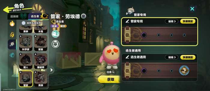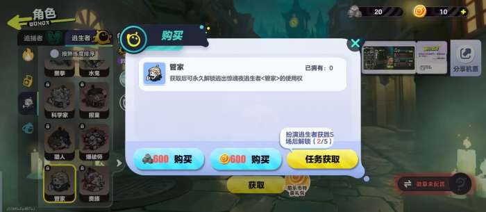 而这一个角色在获取时有三种不同的方法,首先可以通过局内的战斗还有日常任务去获取惊魂矿。这种货币就能够去购买,管家所需要的数量是600个,如果玩家觉得这个方法有一些复杂,也可以选择通过酷乐币购买,同样只需要600个,相对比较简单。通过任务也可以获取,例如扮演逃生者获胜5场之后马上就可以解锁,通过实战积累也可以免费的将它纳入到阵容中,对那些喜欢逃生玩法的玩家而言。这一个解锁方法还是很有趣味性的。