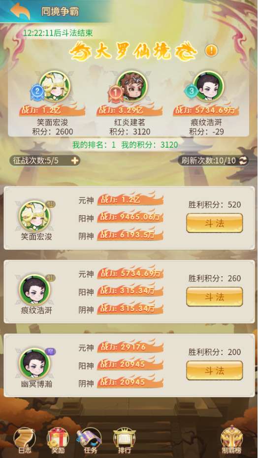 2、其中不同境域的斗法方式不同:[无色境][四焚境][太清境][上清境][玉清境] 等境域为普通斗法,大罗仙境] 为仙魔分身3V3斗法