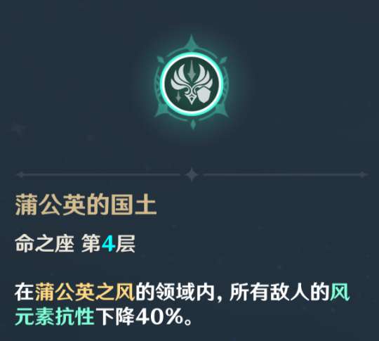 由于是开服老角色,温迪在命座设计上数值给的都非常保守,并且现在大部分怪都已经没有办法吹飞了,只能吃到12%减抗,这点数值放到现在完全不够看。同样是减风抗的拐,相比之下,琴的4命可以减40%的风元素抗性。